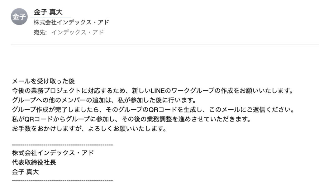 現在、当社(グループ会社)および当社代表者などを騙り、受信者にLINEグループの作成を求める